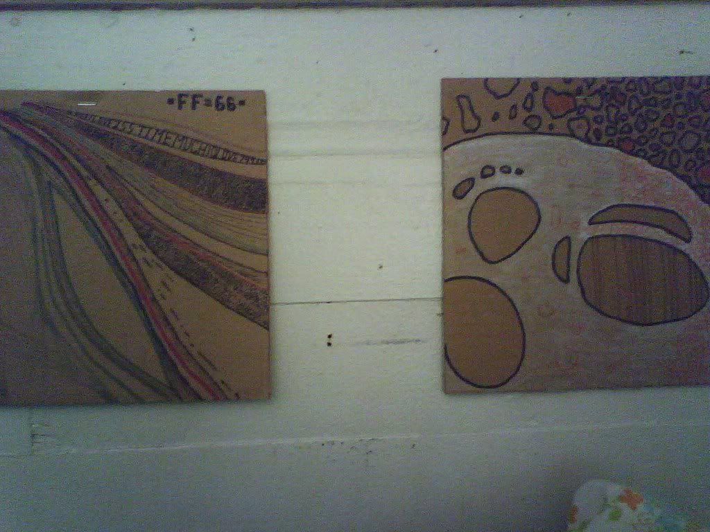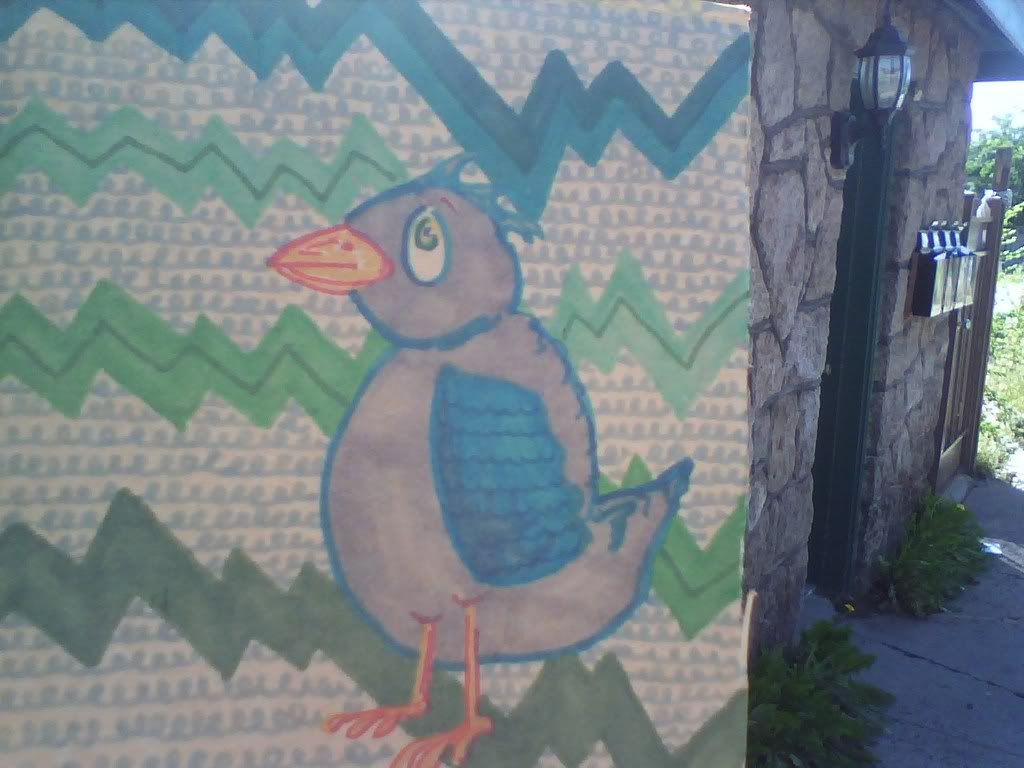 squares put up from those associated with this house, which housed many friends and foes in the years, such as: kevin i, wes w, rene k, robert n, eric p, cate z, etc. i slept in there a couple times, tripped on whiskey and rats, shitty movies and vats of beer. i was pretty peripheral to the place, too. these specific drawings were done by rene k (bird) and kevin i (plane) and now border the house on 2 sides, the house that is now inhabited by strangers mostly, as most have moved out and on.