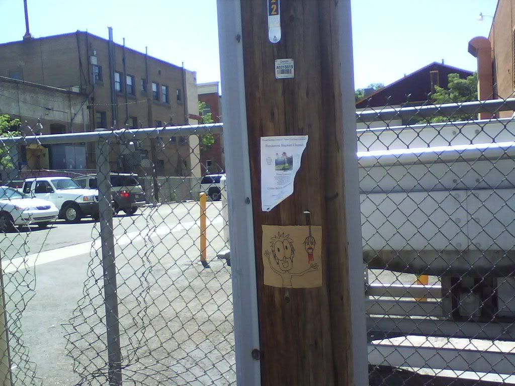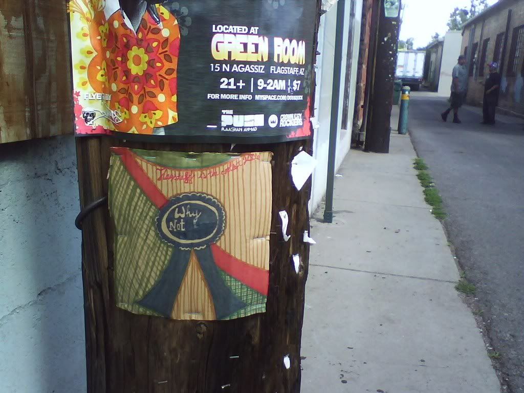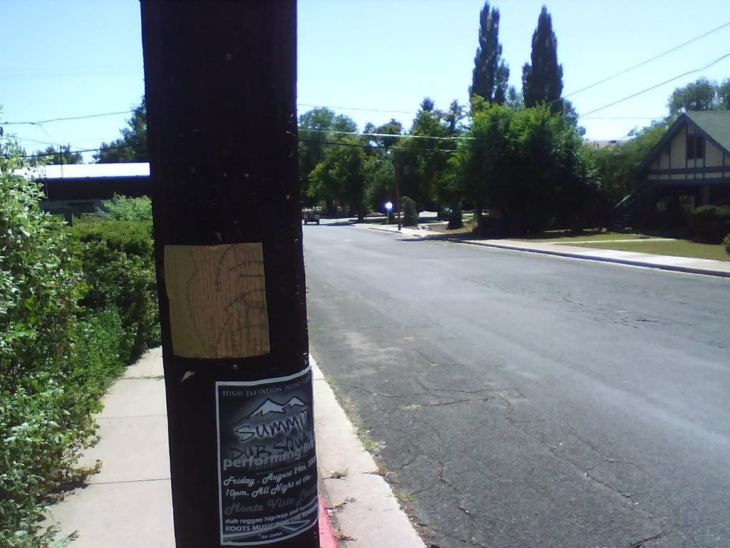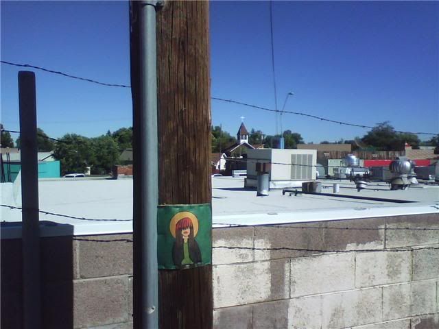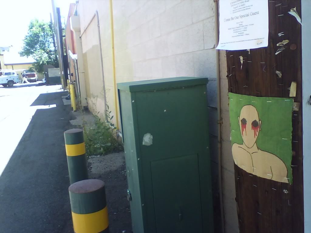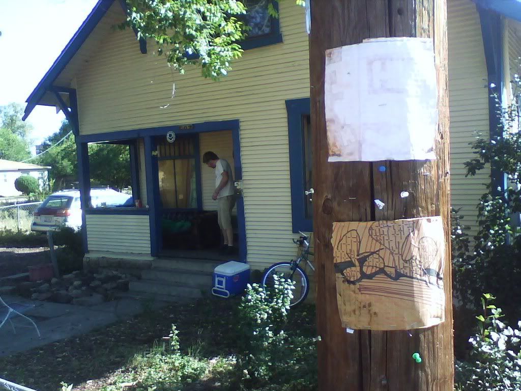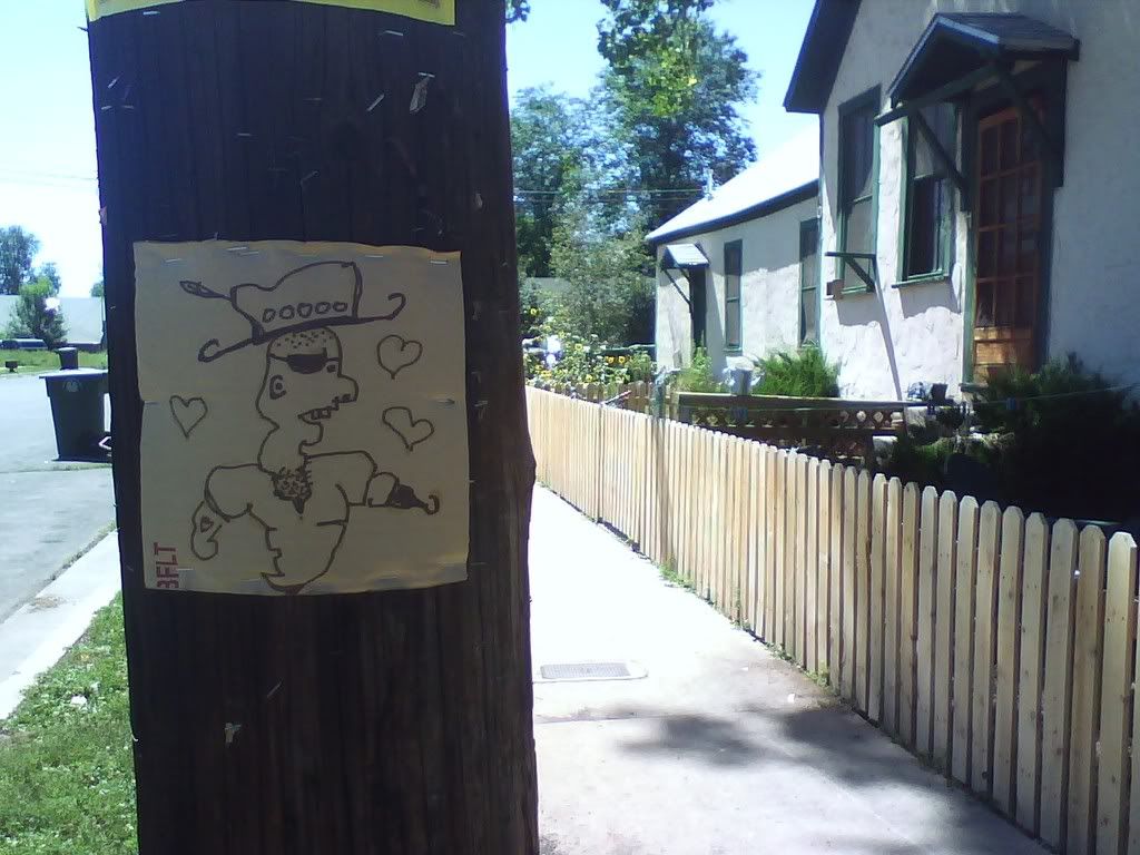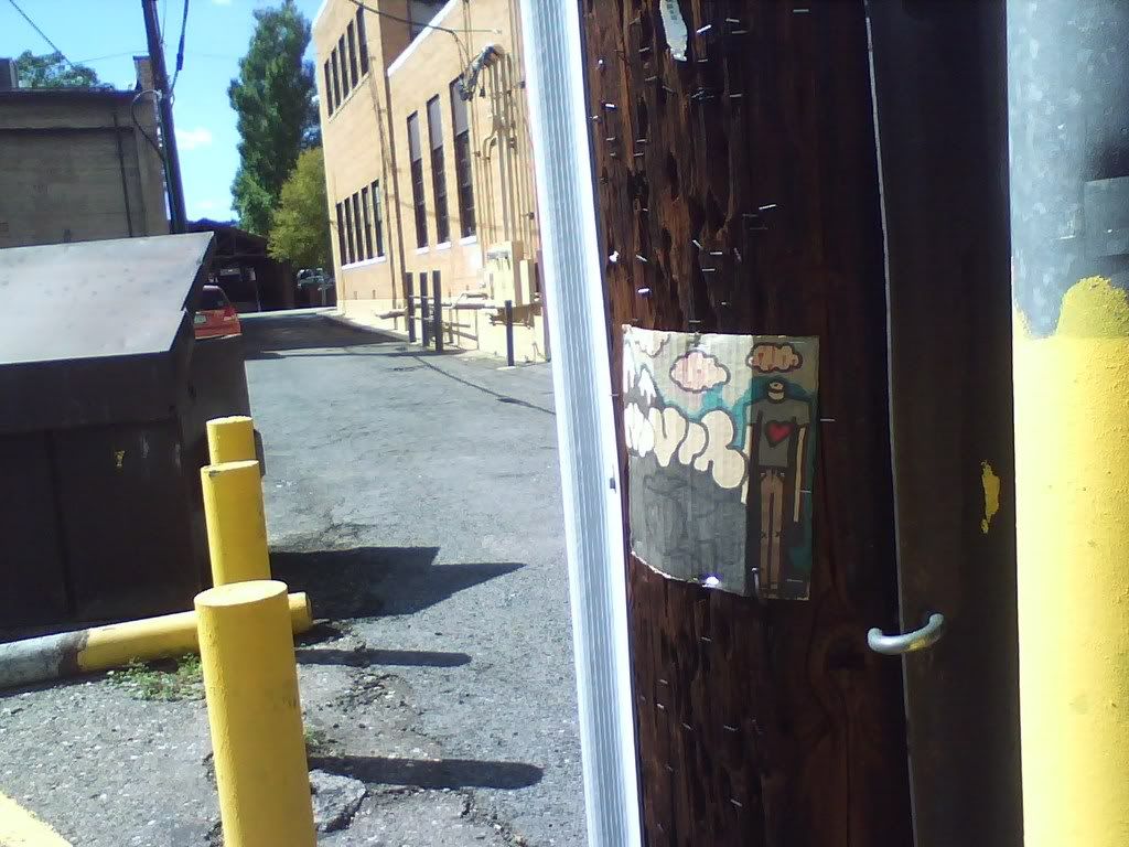 this is one of the 2 squares done by eric. he thinks it's really shitty, hence told me to not put it up. though i did anyways, with him in the background, as you can see in the lower picture. i think it's a neat square. and you can see, previous squares are fading (the one above it on the same pole was the first one i put up, a couple months ago). they're staying up, though, somewhat, in certain places. which leads me to question whether or not this could be considered a criminal act, putting this shit up around town. are telephone poles public property? they should be. regardless, i'm still doing it, but definitely in the bright sun of day, not being shady at all. one of the first ones i put up, right by the hospital (the heart square below), is still up, or was last time i was up there. and "irregardless", all this shit is documented, so if there is a case against me, evidence will not be hard to find at all. whatevs, life is art. ask logan.