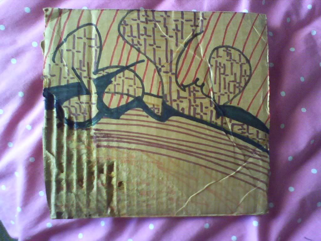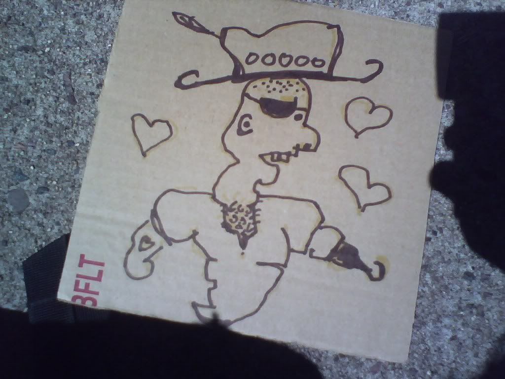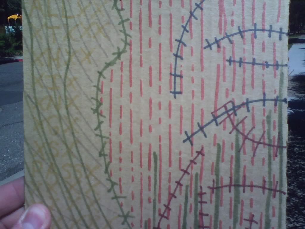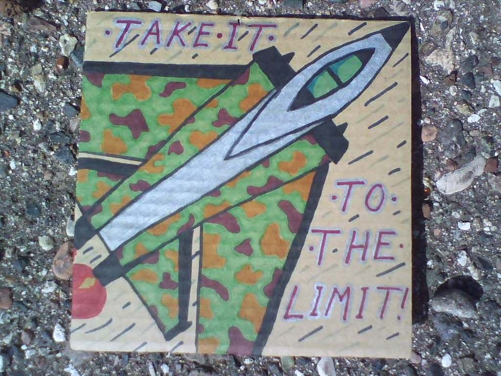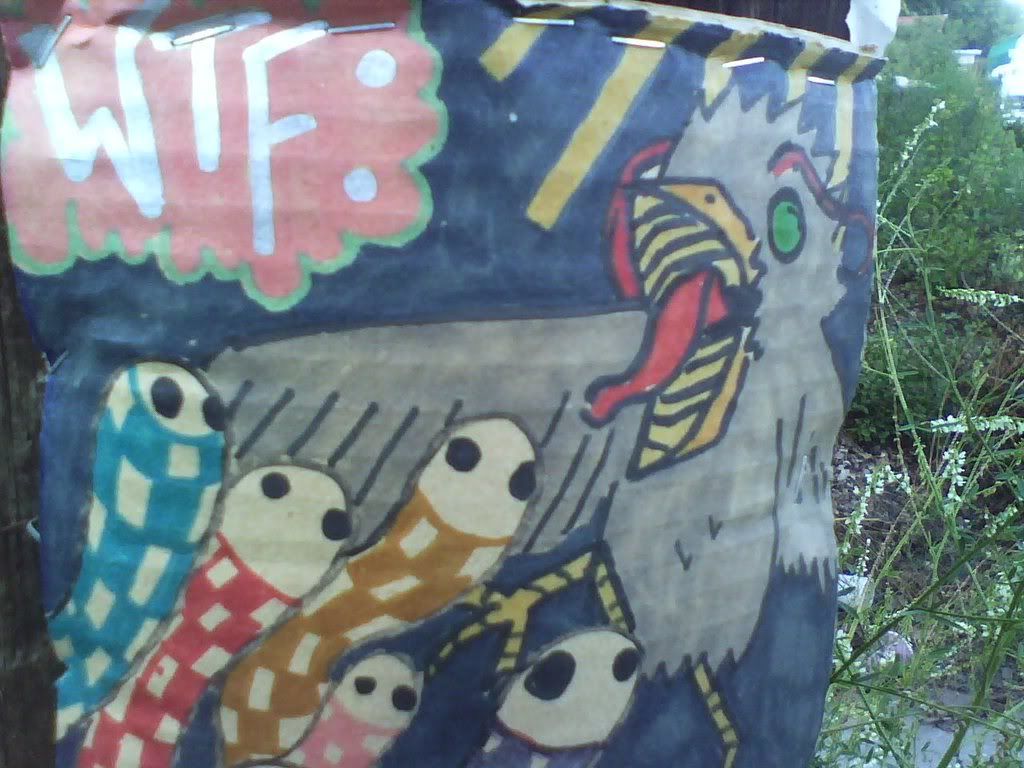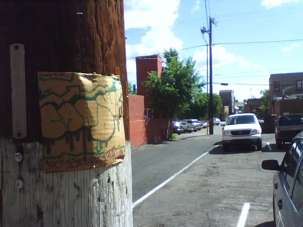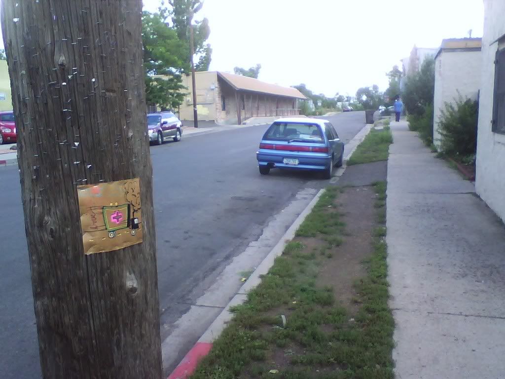 this is a square done by a kid named nick, i think. pretty neat, and i put it in my neighborhood. it was in a good spot, by a baseball field, and then it blew away pretty quickly, as i saw it on the ground the next day like 2 blocks away. i didn't pick it up, but imaged some kid picking it up and thinking it was cool and bringing it home. prolly not, but it's nice to daydream.