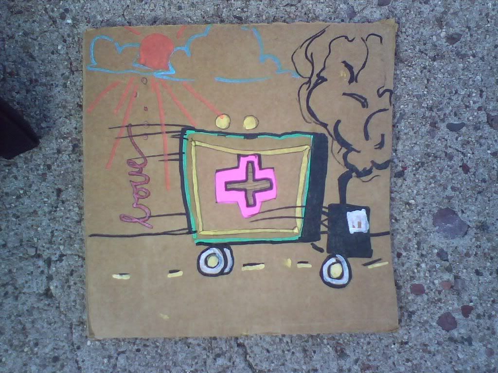 this was a square done by rene k, depicting the time we got into a car accident that was my fault. no major injuries, but she bumped her head pretty hard and was freaked out; made a trip to the hospital. i haven't put this square up, and don't think i will anytime soon. i'm kinda getting bored of this project. i think i'll put up a few more key ones and then be done with it.